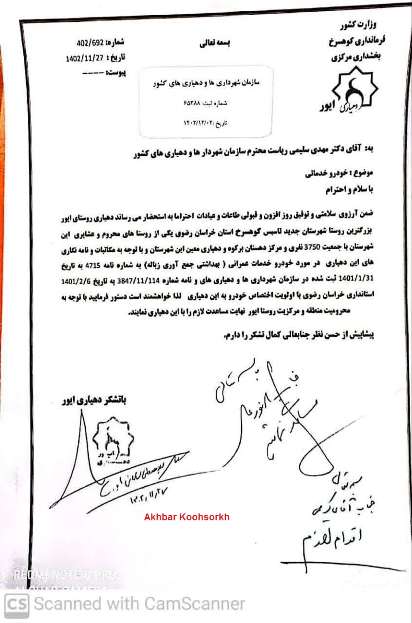 بعد از پیگیریهای مکرر از طریق دفتر روستایی استانداری خراسان رضوی و همچنین سازمان دهیاریها و شهرداریهای کل کشور ، پیگیریهای نیکبین نماینده شهرستان کوهسرخ ، یک دستگاه نیسان به دهیاری ایور جهت حمل زباله تخصیص و تحویل شد.