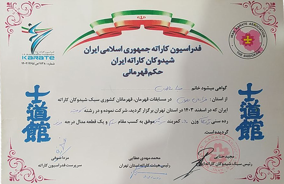 رسانه کوهسرخ | خانم مبینا سالاری تنها نماینده شهرستان کوهسرخ در مسابقات قهرمان قهرمانان کشوری سبک شیدوکان کاراته که اسفندماه در تهران برگزار شد ، توانست مقام سوم مسابقات را کسب و مدال برنز را از آن خود کند.